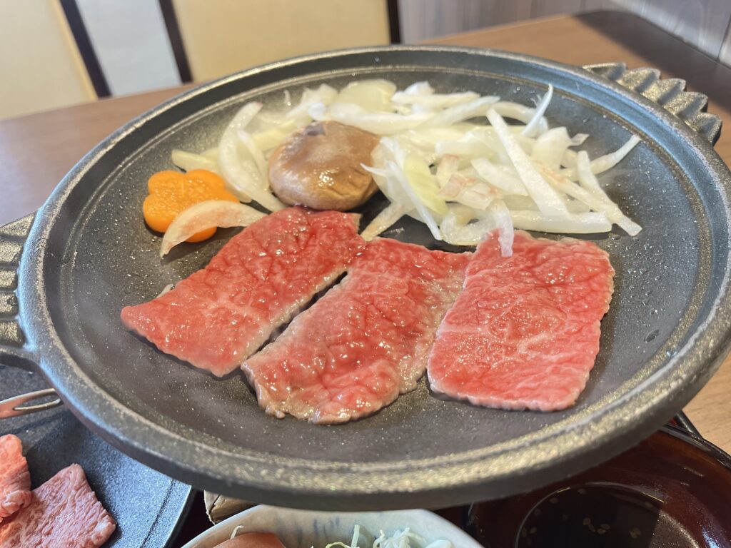 まるよしさんでは、松阪牛の肩・モモなどの赤身肉100gのランチが¥3,630でいただけるとのこと。