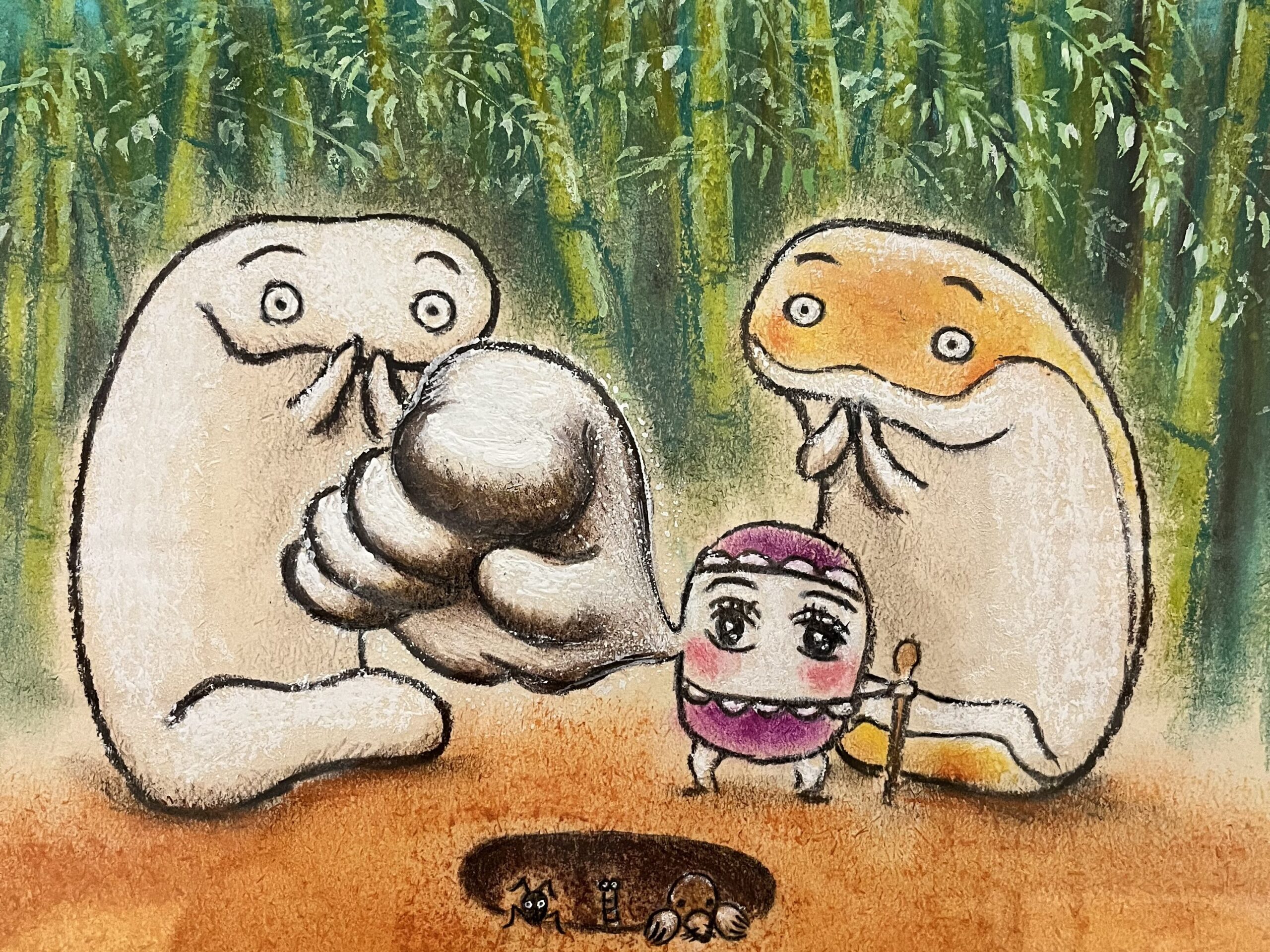 食材が擬人化されている面白さやそのフォルムや擬音の面白さに笑うでしょうし、このお話を通じて自かつて日本人が持っていた人とのつながりの良さが自然に伝わると思います。