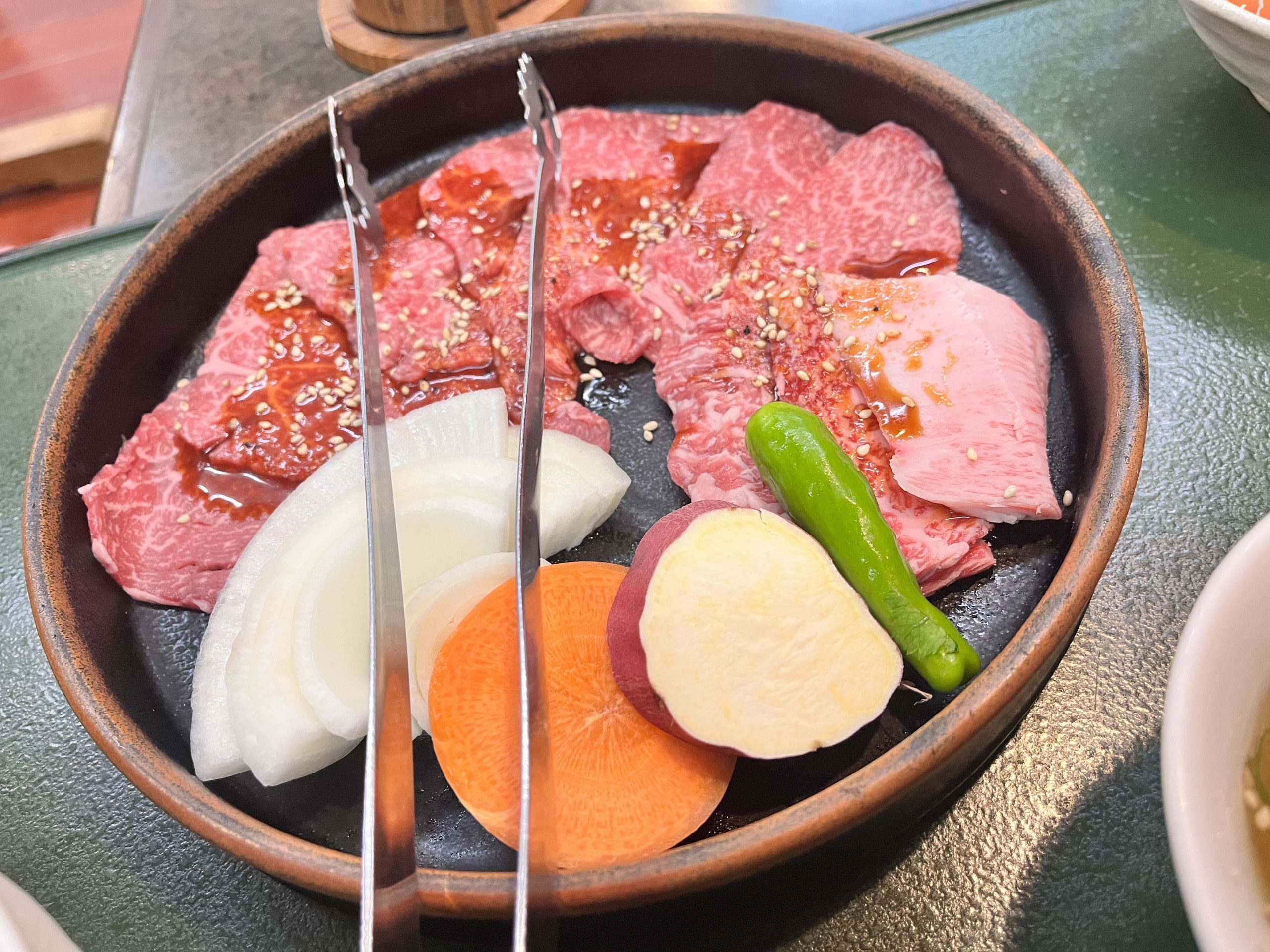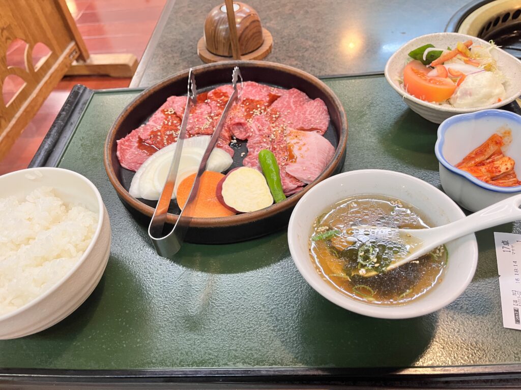 お肉は国産黒毛和牛のモモとカルビ、ご飯、スープ、サラダ、野菜とボリュームも良いです。