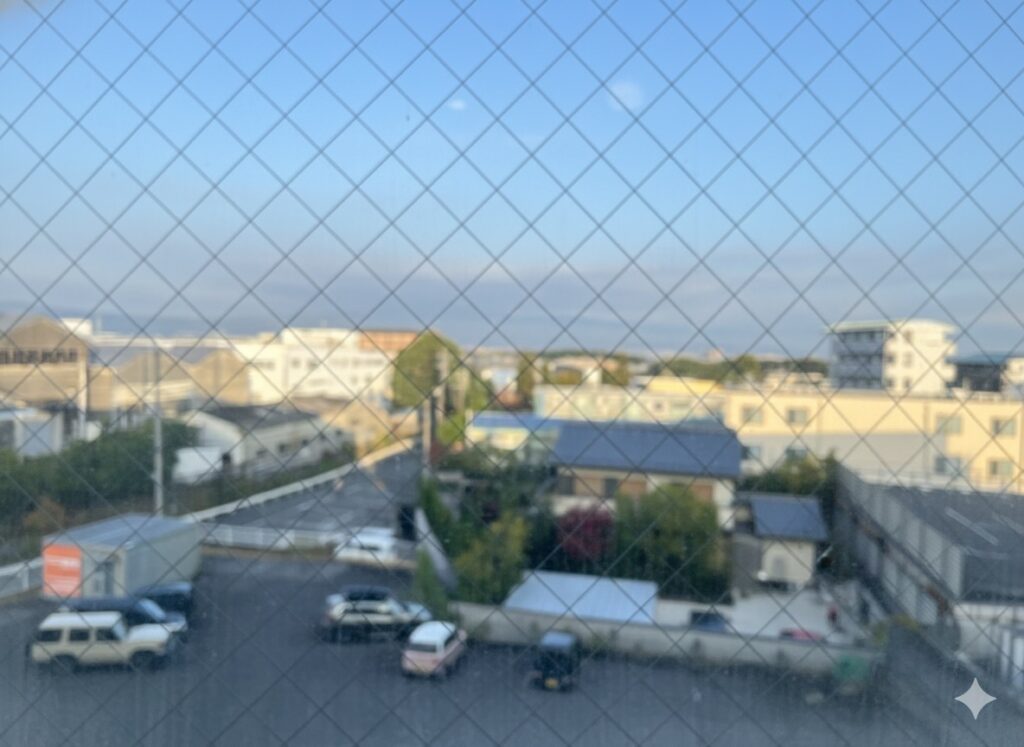 お部屋からの朝の景色です。月曜日だったので住宅街の通勤風景をながめていました。