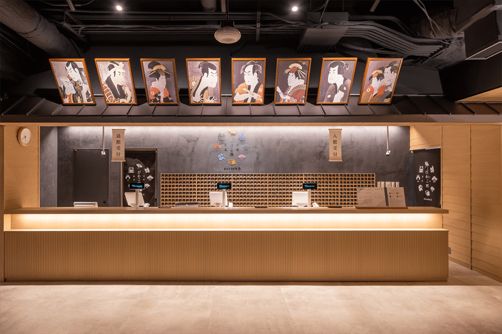 おふろcafeへはホテル一階の宿泊者専用入り口で靴やスリッパを脱いで入ります。